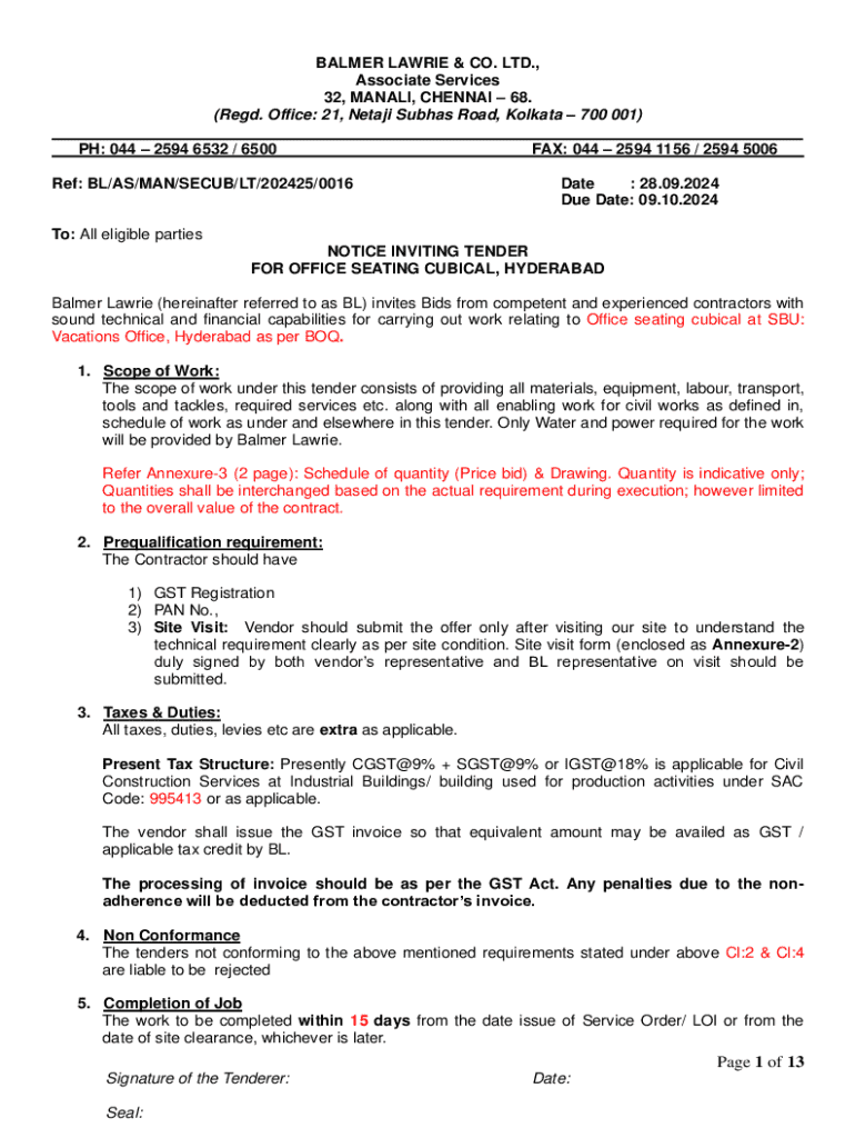 BALMER LAWRIE & CO. LTD., Associate Services 32, MANALI, CHENNAI 68. (Regd. Office: 21, Netaji Subhas Road, Kolkata 700 001) PH: 044 2594 6532 / 6500 Ref: BL/AS/MAN/SECUB/LT/202425/0016FAX: 044 2594
