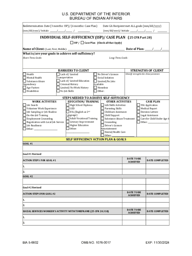This form is used by clients and social services workers to outline the goals, barriers, and action steps necessary for achieving self-sufficiency within the General Assistance Program. It includes sections for personal information, goals, barriers, strengths, and activities aimed at facilitating client independence.