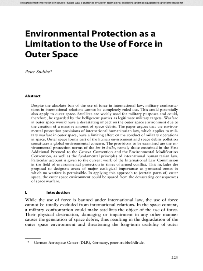 This article from International Institute of Space Law is published by Eleven international publishing and made available to anonieme bezoekerEnvironmental Protection as a Limitation to the Use of