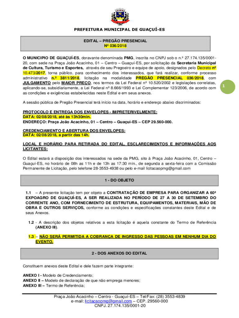 O Edital contém as diretrizes e condições para a realização da licitação visando a contratação de empresa para organizar a 60ª Expoagro de Guaçuí-ES, a ser realizada de 27 a 30 de setembro