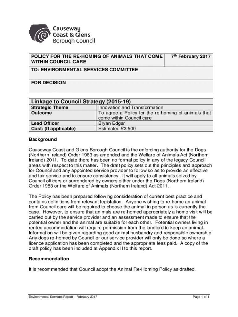 POLICY FOR THE REHOMING OF ANIMALS THAT COME WITHIN COUNCIL CARE7th February 2017TO: ENVIRONMENTAL SERVICES COMMITTEE FOR DECISIONLinkage to Council Strategy (201519) Strategic Theme Outcome Lead