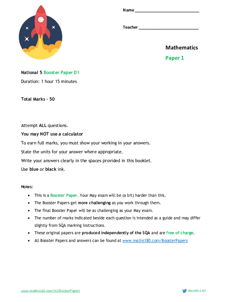 Name ___Teacher ___Mathematics Paper 1 National 5 Booster Paper D1 Duration: 1 hour 15 minutesTotal Marks 50Attempt ALL questions. You may NOT use a calculator To earn full marks, you must show your