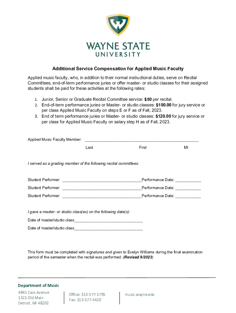 This form is used by applied music faculty to document their participation in recital committees, performance juries, and master or studio classes for additional compensation as per the outlined rates for different faculty salary steps.