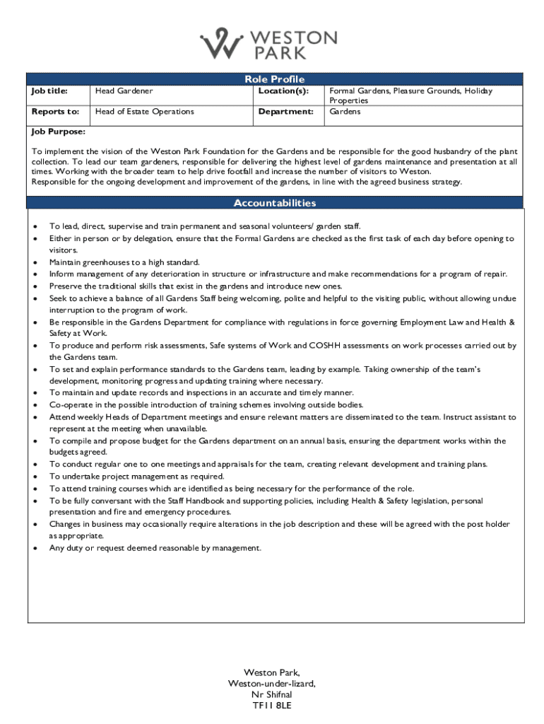 Role Profile Job title:Head GardenerLocation(s):Reports to:Head of Estate OperationsDepartment:Formal Gardens, Pleasure Grounds, Holiday Properties GardensJob Purpose: To implement the vision of the