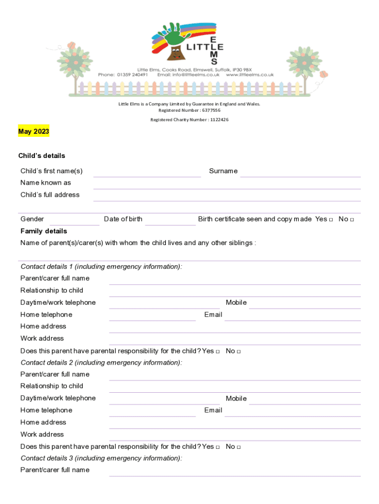 Li le Elms is a Company Limited by Guarantee in England and Wales. Registered Number : 6377556 Registered Charity Number : 1122426May 2023Childs details Childs first name(s)SurnameName known as Childs full addressGenderDate of birthBirth certificate seen and copy made Yes No Family details Name of parent(s)/carer(s) with whom the child lives and any other siblings : Contact details 1 (including emergency information): Parent/carer full name Relationship to child Daytime/work