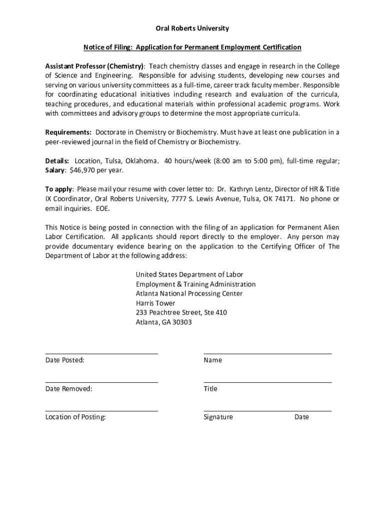 This document provides information regarding the application for a permanent employment certification for the position of Assistant Professor in Chemistry at Oral Roberts University. It outlines the responsibilities, qualifications, and application process.