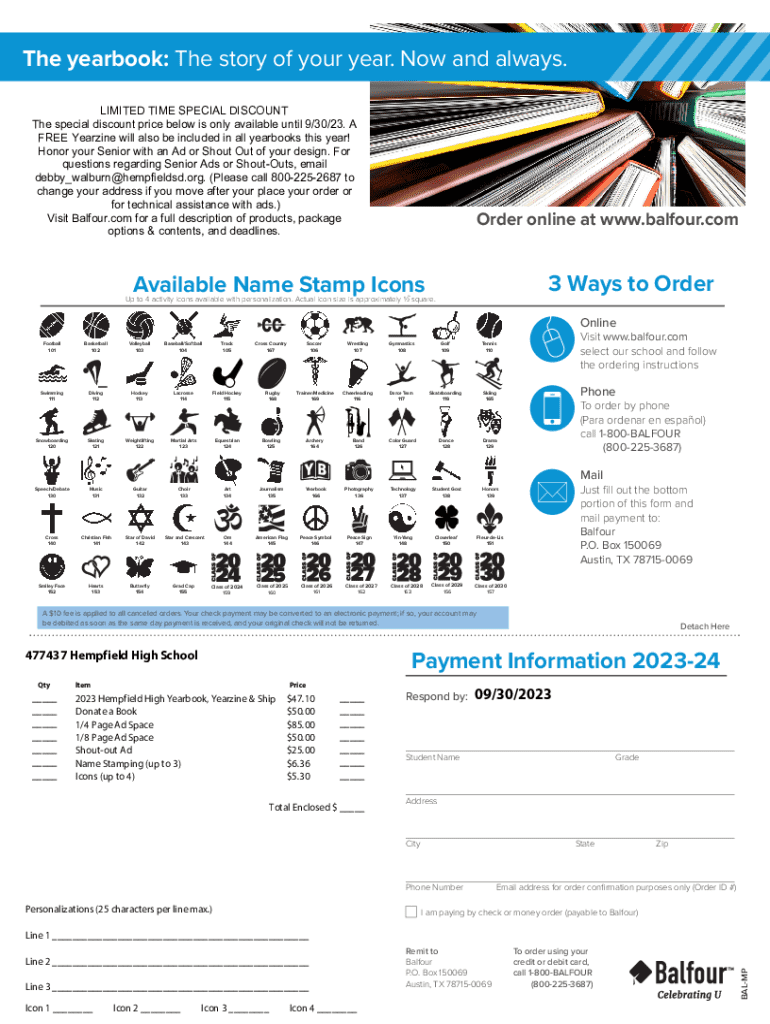 The yearbook: The story of your year. Now and always. LIMITED TIME SPECIAL DISCOUNT The special discount price below is only available until 9/30/23. A FREE Yearzine will also be included in all yearbooks this year! Honor your Senior with an Ad or Shout Out of your design. For questions regarding Senior Ads or ShoutOuts, email debby_walburn@hempfieldsd.org. (Please call 8002252687 to change your address if you move after your place your order or for technical assistance with ads.) Visit Balfour