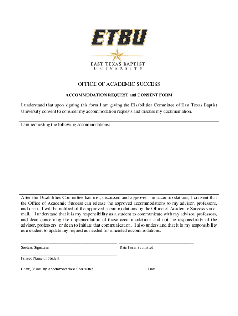 This form is used by students to request accommodations due to disabilities at East Texas Baptist University. By signing, students consent to the Disabilities Committee reviewing their requests and