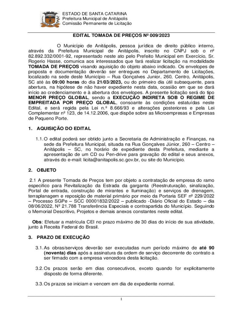 O presente edital visa a aquisição de serviços para a revitalização da Estrada da garganta, incluindo reestruturação, sinalização, construção de mirantes e iluminação, obedecendo às