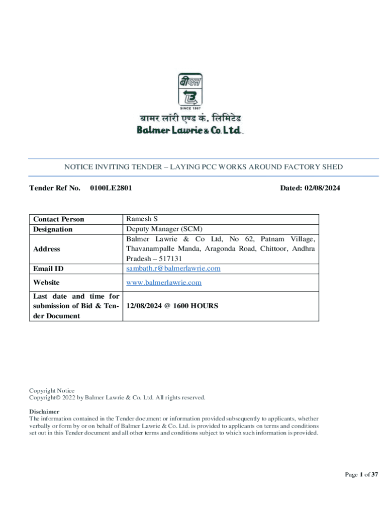 NOTICE INVITING TENDER LAYING PCC WORKS AROUND FACTORY SHED Tender Ref No.0100LE2801Dated: 02/08/2024Email IDRamesh S Deputy Manager (SCM) Balmer Lawrie & Co Ltd, No 62, Patnam Village, Thavanampalle