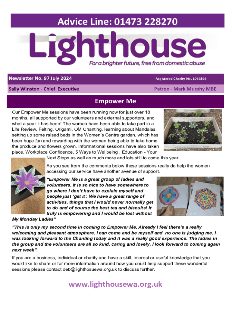 Advice Line: 01473 228270Newsletter No. 97 July 2024Registered Charity No. 1069296Sally Winston Chief ExecutivePatron Mark Murphy MBEEmpower Me Our Empower Me sessions have been running now for just