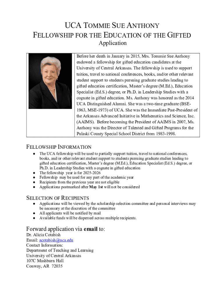 This application form is for the UCA Tommie Sue Anthony Fellowship, which supports gifted education candidates at the University of Central Arkansas for graduate studies leading to various degrees