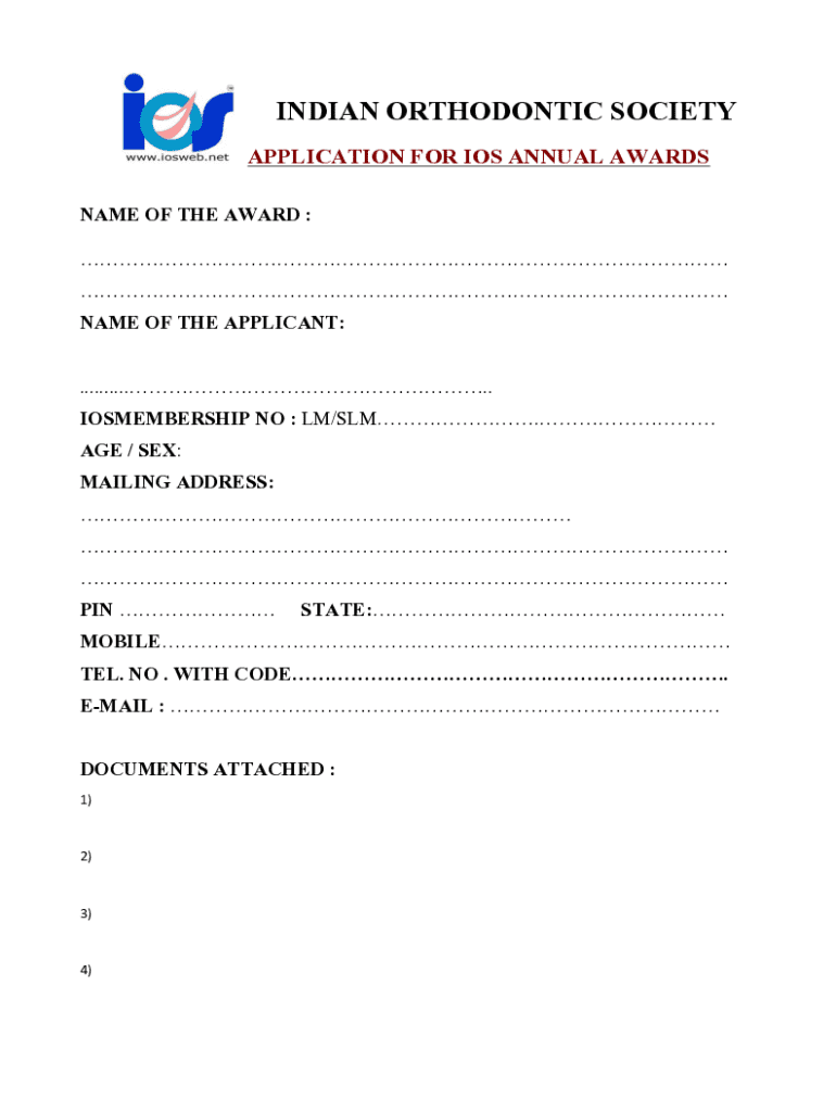 This application is for individuals seeking to apply for the Indian Orthodontic Society\'s Annual Awards. The form collects personal information, including the applicant\'s name, membership number,