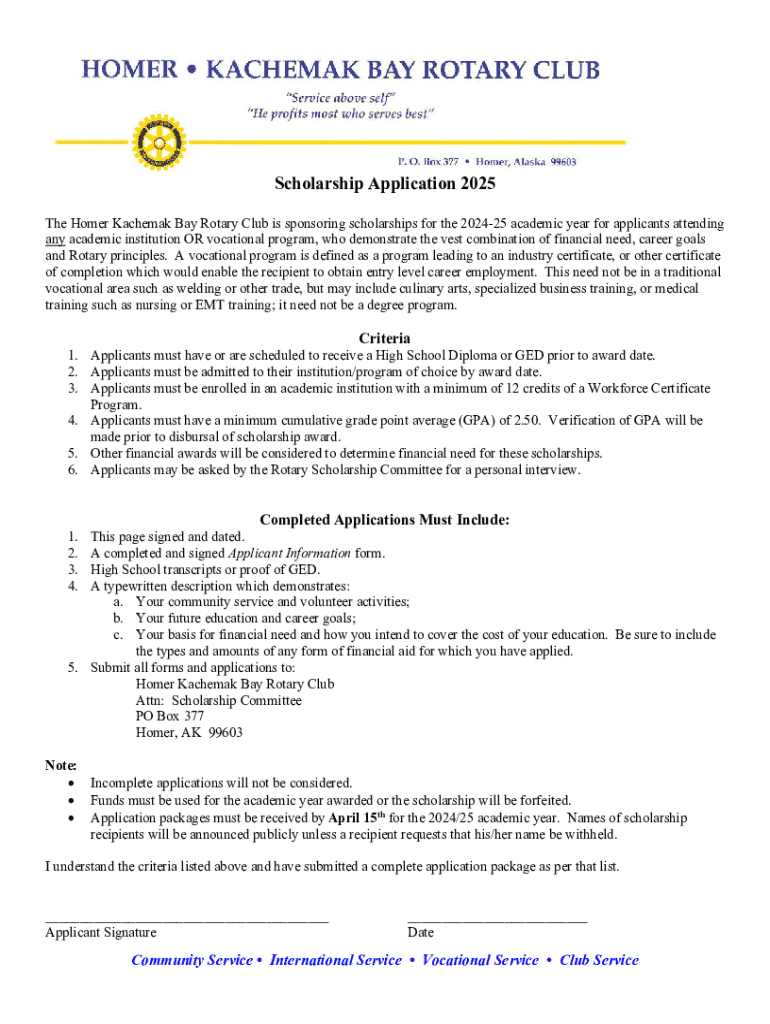 Este formulario es para solicitar becas patrocinadas por el Homer Kachemak Bay Rotary Club para el año académico 2024-25. Los solicitantes deben demostrar necesidad financiera, metas profesionales y principios rotarios, y deben estar inscritos en una institución académica o programa vocacional.