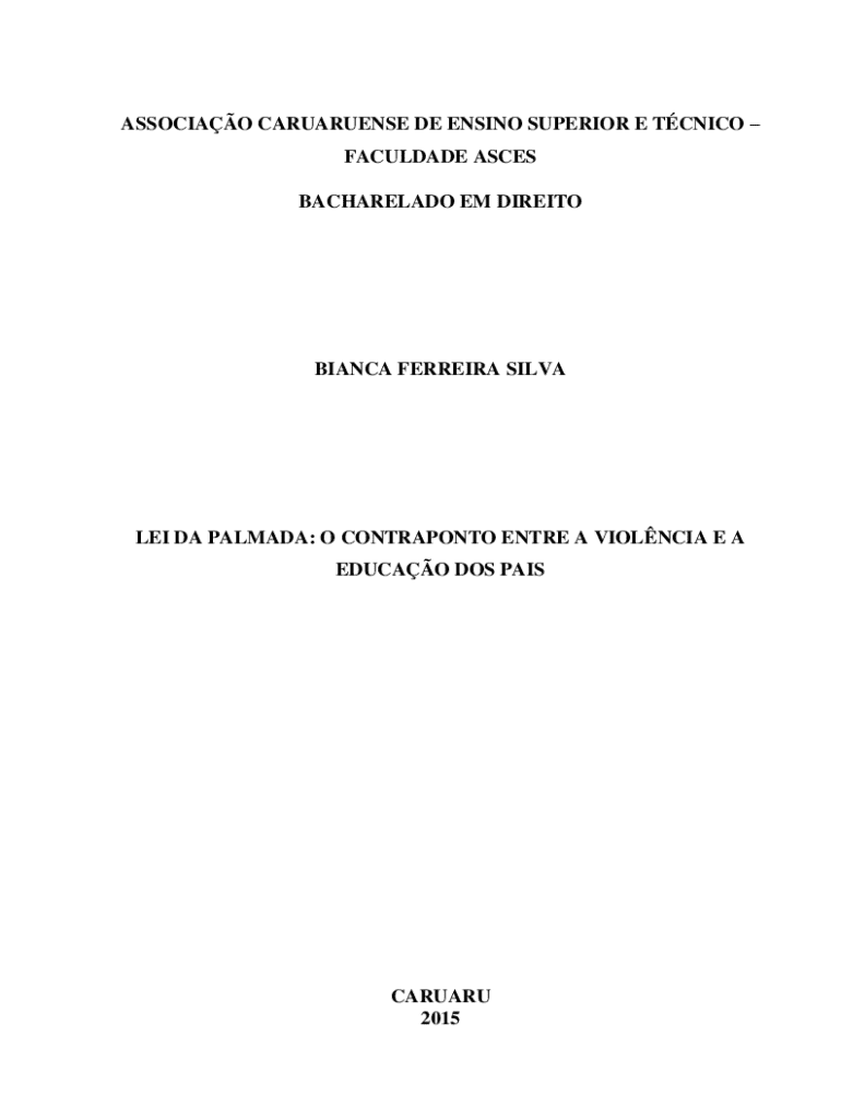 0ASSOCIAO CARUARUENSE DE ENSINO SUPERIOR E TCNICO FACULDADE ASCES BACHARELADO EM DIREITOBIANCA FERREIRA SILVALEI DA PALMADA: O CONTRAPONTO ENTRE A VIOLNCIA E A EDUCAO DOS PAISCARUARU 20151BIANCA FERREIRA