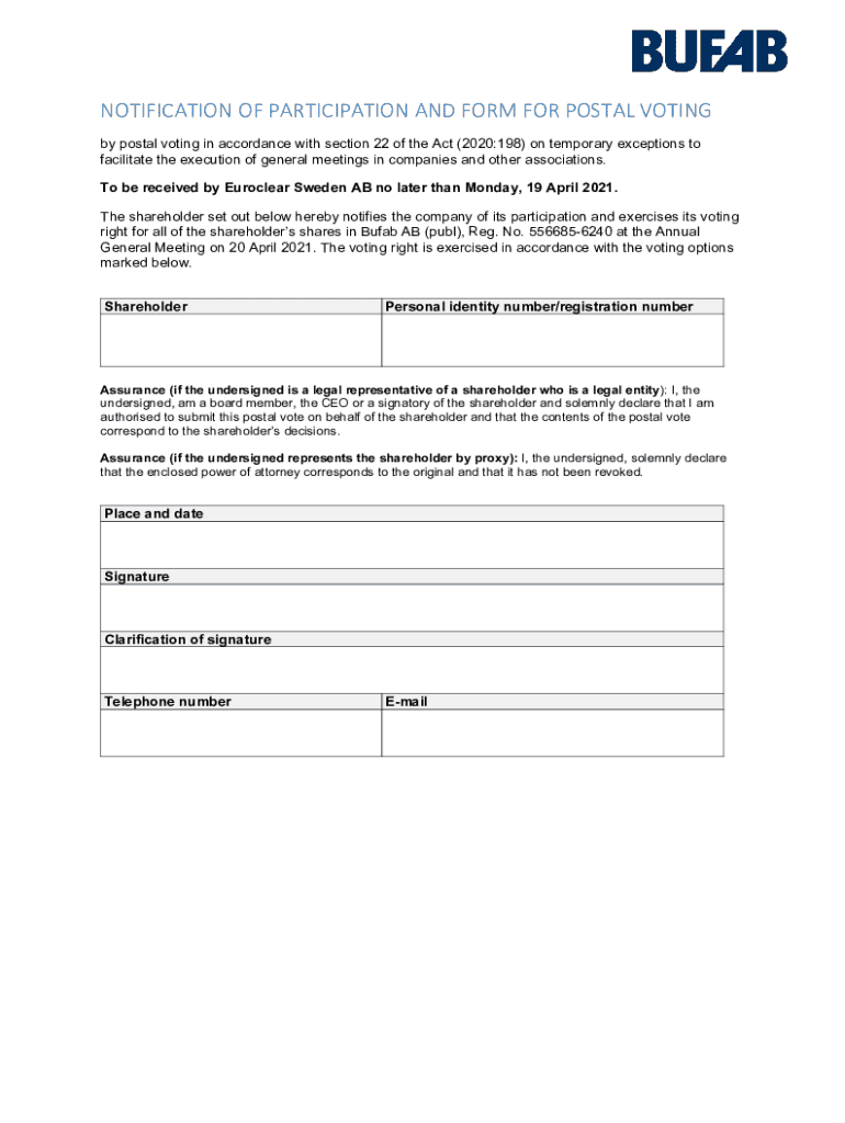 This document serves as a notification for shareholders of Bufab AB to participate in the Annual General Meeting via postal voting. It includes necessary assurances for both legal representatives