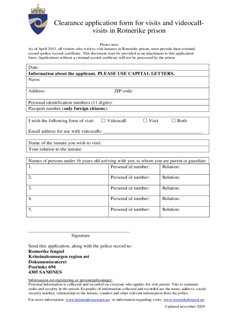 Get the free Clearance Application Form for Visits and Videocallvisits in Romerike Prison