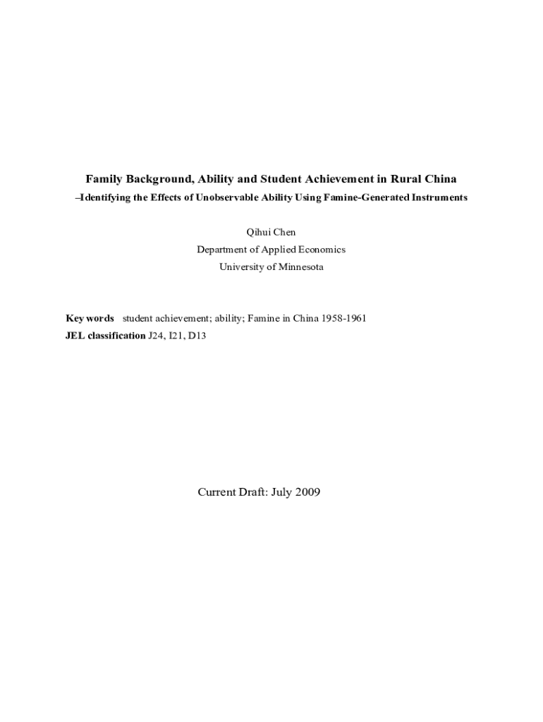 Family Background, Ability and Student Achievement in Rural China Identifying the Effects of Unobservable Ability Using FamineGenerated Instruments Qihui Chen Department of Applied Economics University