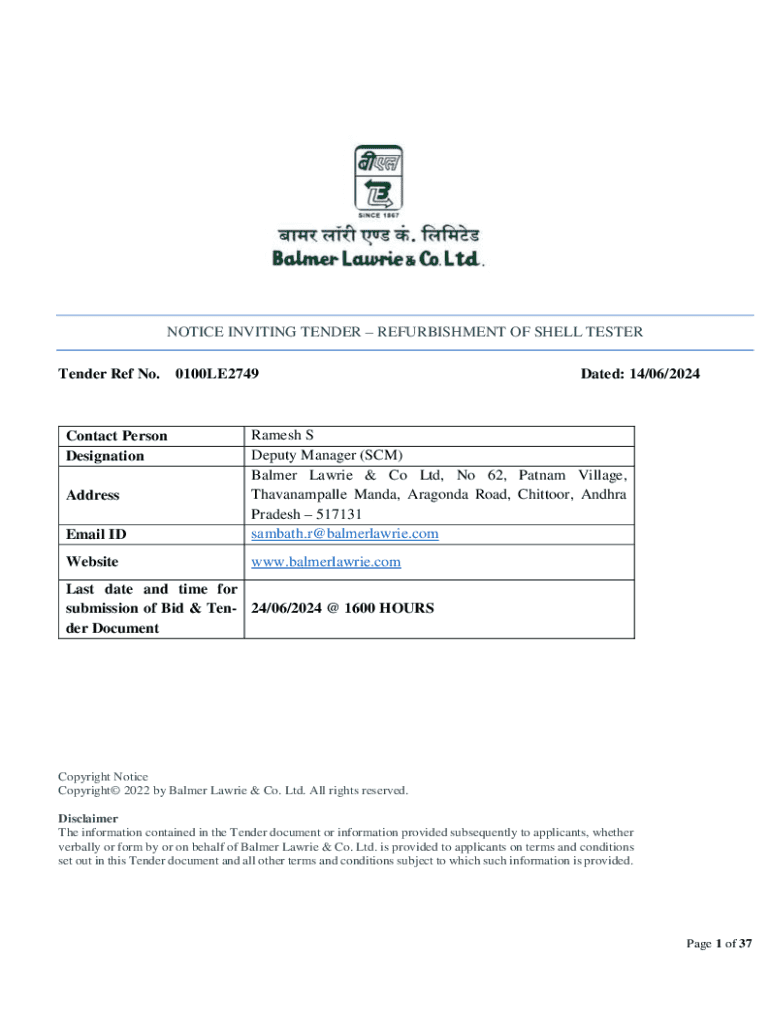 NOTICE INVITING TENDER REFURBISHMENT OF SHELL TESTER Tender Ref No.0100LE2749Dated: 14/06/2024Email IDRamesh S Deputy Manager (SCM) Balmer Lawrie & Co Ltd, No 62, Patnam Village, Thavanampalle Manda,