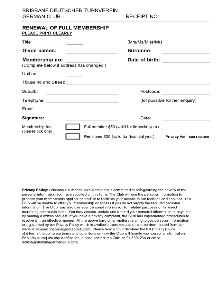 This form is used for the renewal of full membership at the Brisbane Deutscher Turnverein German Club. It requires personal information including title, given names, surname, membership number, date