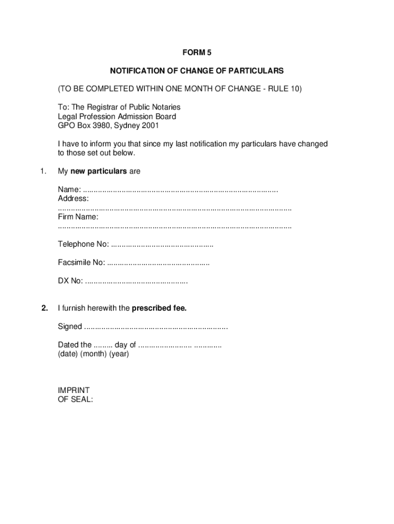 This form is used to notify the Registrar of Public Notaries about changes in a notary\'s particulars. It must be completed within one month of any change, providing updated information such as name,