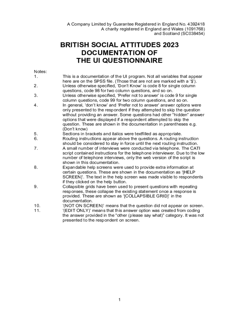Document detailing the UI questionnaire for the British Social Attitudes survey, including instructions, variable coding, and response routing for a variety of topics including demographics, politics, and social issues.