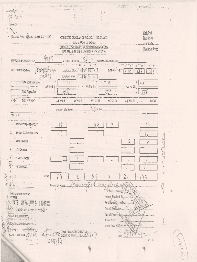 tX .; O rig in a lO btained From :3 , A\'bad. 2141507COMBINED CHALLAN Or A7C. N O .l. 2,10. 21, & 22 ___ (STATE BANK OF I N D I A ) .___D u p lic a t e T r i p l i c a t e ___E M P L O Y E E \'S PR O V ID EN T FUND ORG A N ISA TIO N (USE SEPARATE CHALLAN FO R EACH MONTH)....Q u a d r u p lic a t e5 2 ESTABLISHMENT CODE NO. GJACCOUNT GROUPNODUES FOR THE .MONTH O F:Employees Share fVCi T rEm ployer share T o tal B tto r S