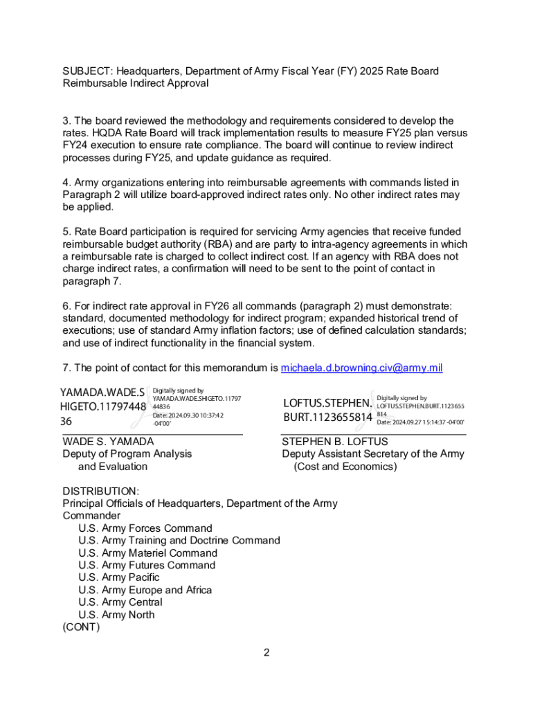DEPARTMENT OF THE ARMY 103 ARMY PENTAGON WASHINGTON, DC 20310010325 SEPTEMBER 2024 MEMORANDUM FOR RECORD SUBJECT: Headquarters, Department of Army Fiscal Year (FY) 2025 Rate Board Reimbursable Indirect Approval 1. Reference: a. Army Financial Management and Comptroller Rates and Guidance, retrieved from https://www.asafm.army.mil/CostMaterials/HQDARateBoard/. b. Department of Defense Financial Management Regulation, Volume 11A. c. Army Indirect Rate Board Charter Army Financial Management &...