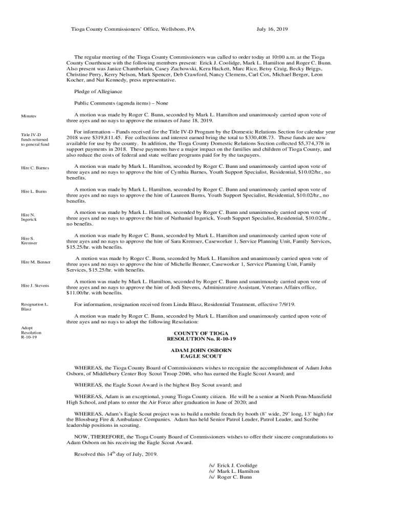 Tioga County Commissioners Office, Wellsboro, PAJuly 16, 2019The regular meeting of the Tioga County Commissioners was called to order today at 10:00 a.m. at the Tioga County Courthouse with the following