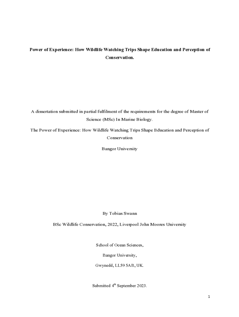 Power of Experience: How Wildlife Watching Trips Shape Education and Perception of Conservation.A dissertation submitted in partial fulfilment of the requirements for the degree of Master of Science (MSc) In Marine Biology. The Power of Experience: How Wildlife Watching Trips Shape Education and Perception of Conservation Bangor UniversityBy Tobias Swann BSc Wildlife Conservation, 2022, Liverpool John Moores UniversitySchool of Ocean Sciences, Bangor University, Gwynedd, LL59 5AB,...