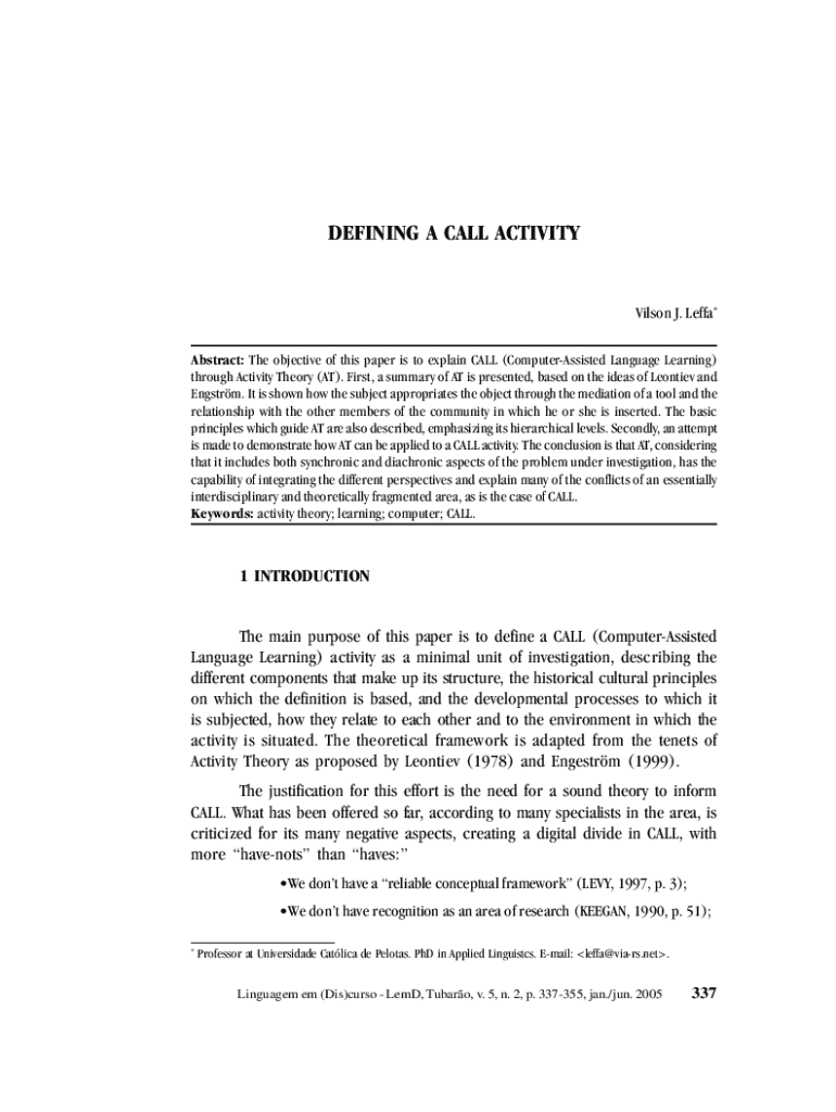 LeffaDEFINING A CALL ACTIVITYVilson J. Leffa* Abstract: The objective of this paper is to explain CALL (ComputerAssisted Language Learning) through Activity Theory (AT). First, a summary of AT is