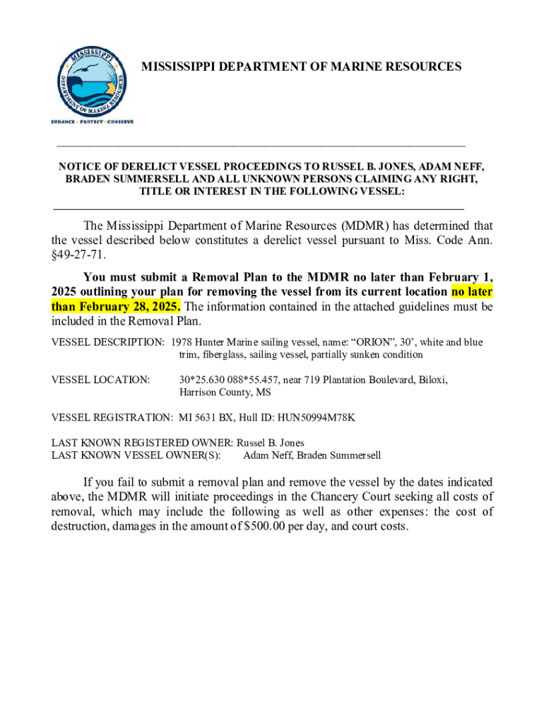 MISSISSIPPI DEPARTMENT OF MARINE RESOURCES___ NOTICE OF DERELICT VESSEL PROCEEDINGS TO RUSSEL B. JONES, ADAM NEFF, BRADEN SUMMERSELL AND ALL UNKNOWN PERSONS CLAIMING ANY RIGHT, TITLE OR INTEREST IN