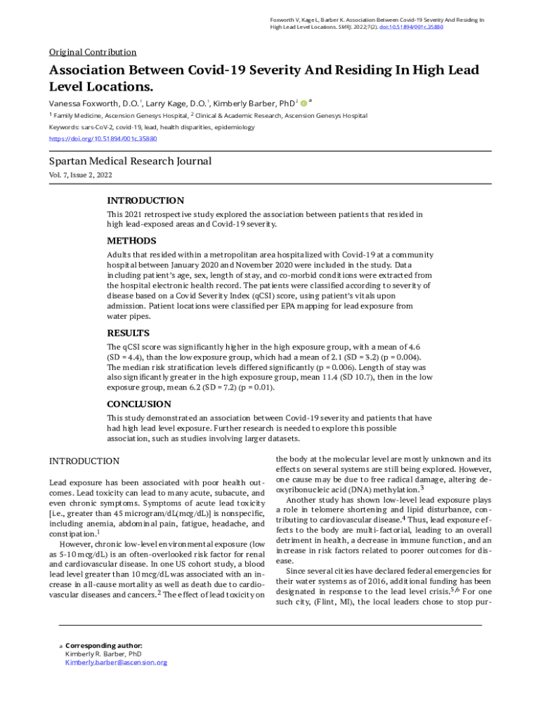 Foxworth V, Kage L, Barber K. Association Between Covid19 Severity And Residing In High Lead Level Locations. SMRJ. 2022;7(2). doi:10.51894/001c.35880Original ContributionAssociation Between Covid19 Severity And Residing In High Lead Level Locations. Vanessa Foxworth, D.O. 1, Larry Kage, D.O. 1, Kimberly Barber, PhD 2 1aFamily Medicine, Ascension Genesys Hospital, 2 Clinical & Academic Research, Ascension Genesys HospitalKeywords: sarsCoV2, covid19, lead, health disparities, epidemiology...