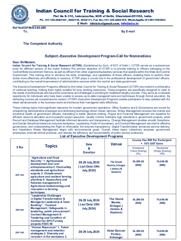 The Indian Council for Training & Social Research invites nominations for its Executive Development Programs aimed at enhancing the skills and knowledge of officers from Central/State Government Services and other organized services. The program offers training on various contemporary topics crucial for effective governance and administrative efficiency.