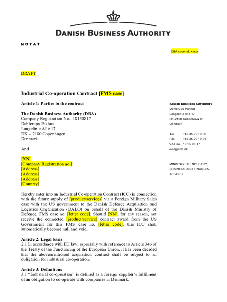 NOTAT DBA case ref. xxxxxDRAFTIndustrial Cooperation Contract [FMS case] Article 1: Parties to the contract The Danish Business Authority (DBA) Company Registration No.: 10150817 Dahlerups Pakhus