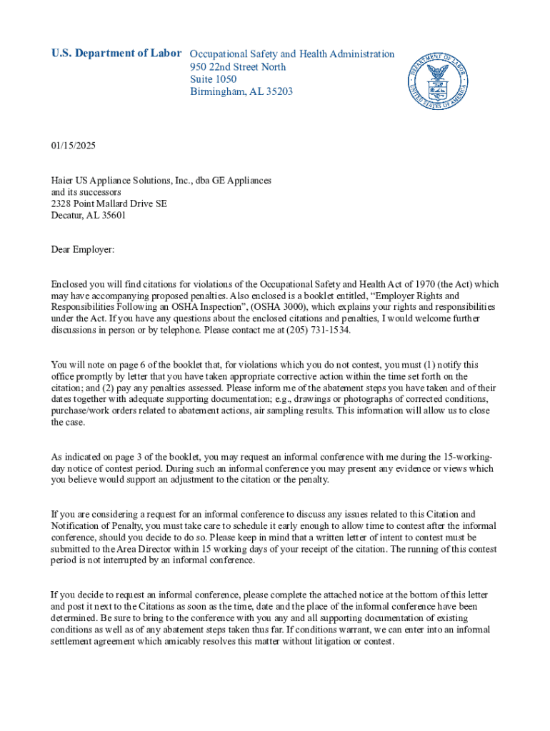 This document serves as a notification for a citation of violations under the Occupational Safety and Health Act of 1970 directed to Haier US Appliance Solutions, Inc. The document outlines the inspection