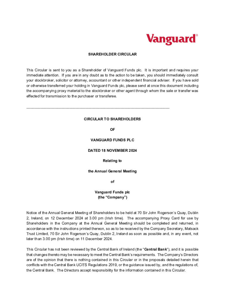This Circular is sent to Shareholders of Vanguard Funds plc, informing them about the Annual General Meeting to be held on 12 December 2024. It includes details regarding the meeting agenda, necessary actions for Shareholders, deadlines for proxy submissions, and the resolutions to be voted upon.