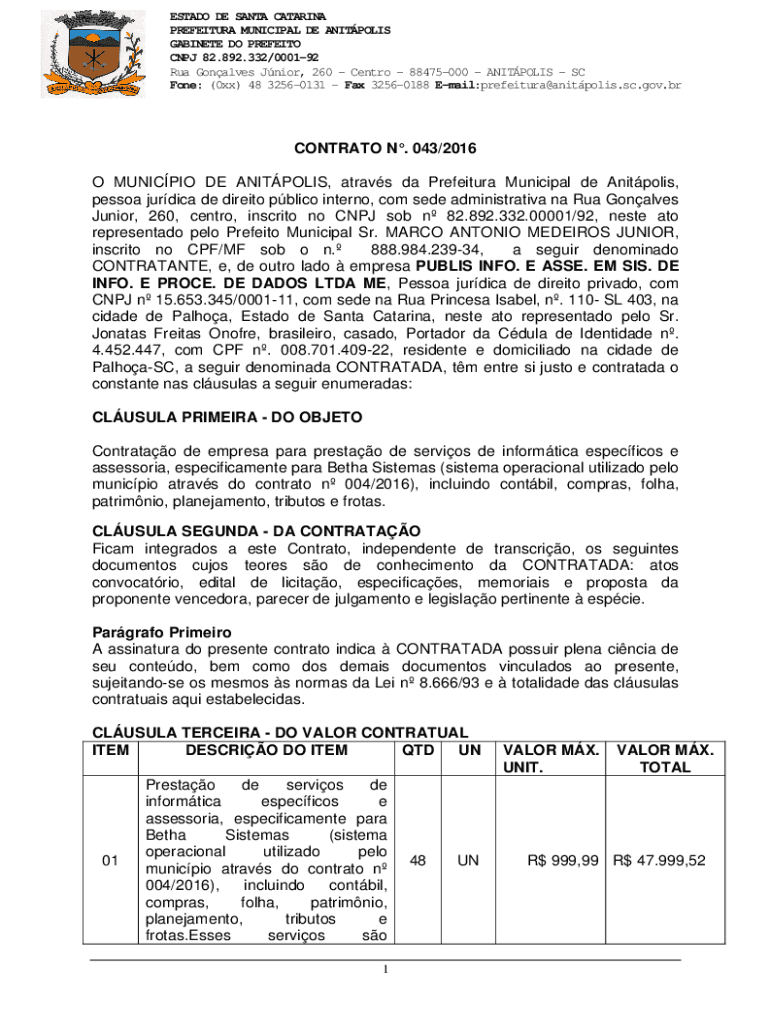ESTADO DE SANTA CATARINA PREFEITURA MUNICIPAL DE ANITPOLIS GABINETE DO PREFEITO CNPJ 82.892.332/000192 Rua Gonalves Jnior, 260 Centro 88475000 ANITPOLIS SC Fone: (0xx) 48 32560131 Fax 32560188 Email:prefeitura@anitpolis.sc.gov.brCONTRATO N. 043/2016 O MUNICPIO DE ANITPOLIS, atravs da Prefeitura Municipal de Anitpolis, pessoa jurdica de direito pblico interno, com sede administrativa na Rua Gonalves Junior, 260, centro, inscrito no CNPJ sob n 82