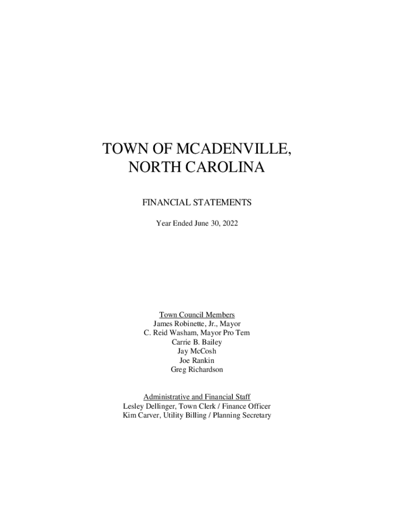 TOWN OF MCADENVILLE, NORTH CAROLINA FINANCIAL STATEMENTS Year Ended June 30, 2022Town Council Members James Robinette, Jr., Mayor C. Reid Washam, Mayor Pro Tem Carrie B. Bailey Jay McCosh Joe Rankin