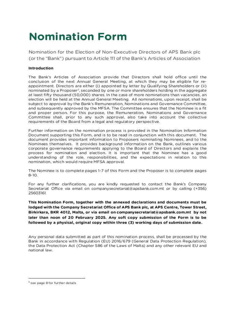 This document serves as a nomination form for individuals seeking election as Non-Executive Directors at APS Bank plc. It outlines the nomination process, requirements, and declarations necessary