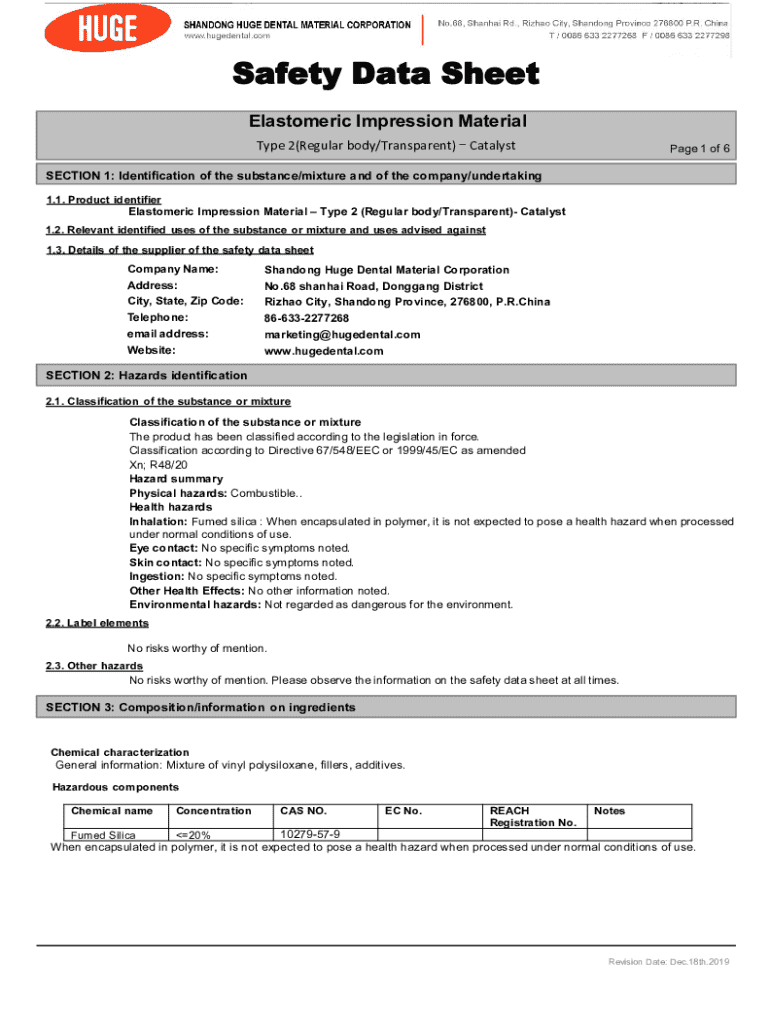 Safety Data Sheet Elastomeric Impression Material Type 2(Regular body/Transparent) CatalystPage 1 of 6SECTION 1: Identification of the substance/mixture and of the company/undertaking 1.1. Product identifierElastomeric Impression Material Type 2 (Regular body/Transparent) Catalyst1.2. Relevant identified uses of the substance or mixture and uses advised against 1.3. Details of the supplier of the safety data sheetCompany Name: Address: City, State, Zip Code: Telephone: email address:...