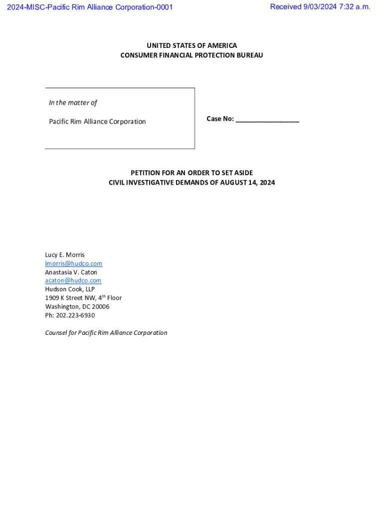 This document is a petition submitted by Pacific Rim Alliance Corporation to the Consumer Financial Protection Bureau requesting the withdrawal of four civil investigative demands issued against the company. The petition outlines the burden of compliance, the lack of specific concerns from the Bureau, and the adverse effects on the operations of the small business due to ongoing investigations.