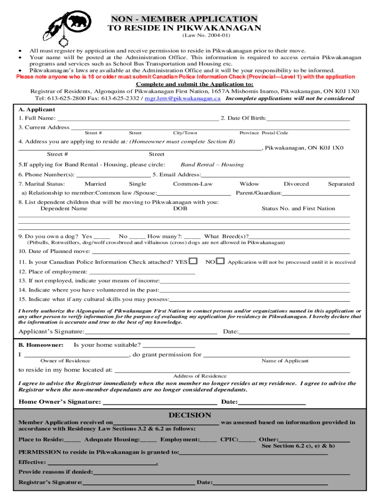 Este formulario es una solicitud para residir en Pikwakanagan. Se requiere que todas las personas registren su solicitud y obtengan permiso antes de mudarse. Se deben proporcionar detalles como nombre, fecha de nacimiento, dirección actual y verificación de antecedentes penales.