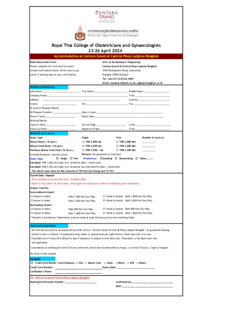 This form is used for reserving accommodations at the Centara Grand at Central Plaza Ladprao Bangkok during the Royal Thai College of Obstetricians and Gynaecologists event from April 23-26, 2024. It requires personal details, booking information, and payment information to secure a hotel room.