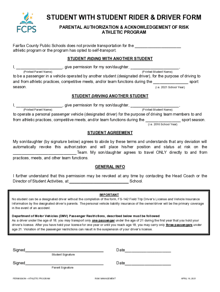 Este formulario permite la autorización parental para que los estudiantes viajen en vehículos de otros estudiantes para prácticas y eventos atléticos, y también establece las condiciones y riesgos asociados.