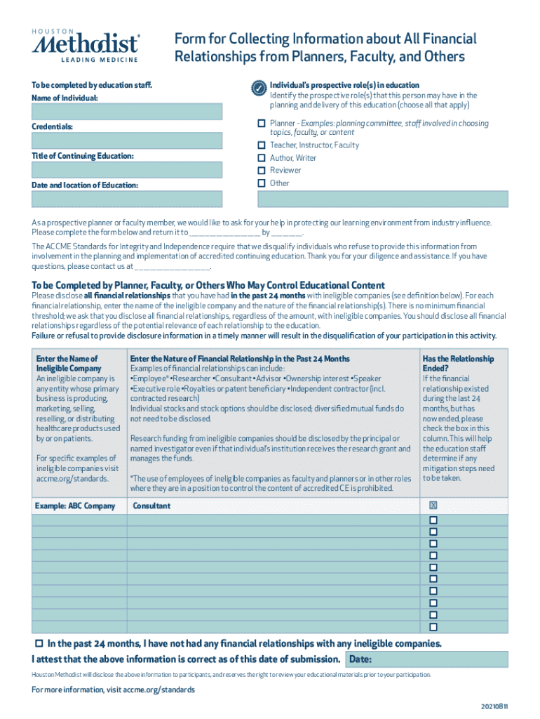 Form for Collecting Information about All Financial Relationships from Planners, Faculty, and Others To be completed by education staff. Name of Individual:Individuals prospective role(s) in education Identify the prospective role(s) that this person may have in the planning and delivery of this education (choose all that apply)Credentials:Planner Examples: planning committee, staff involved in choosing topics, faculty, or contentTitle of Continuing Education:Teacher, Instructor, Faculty Author,