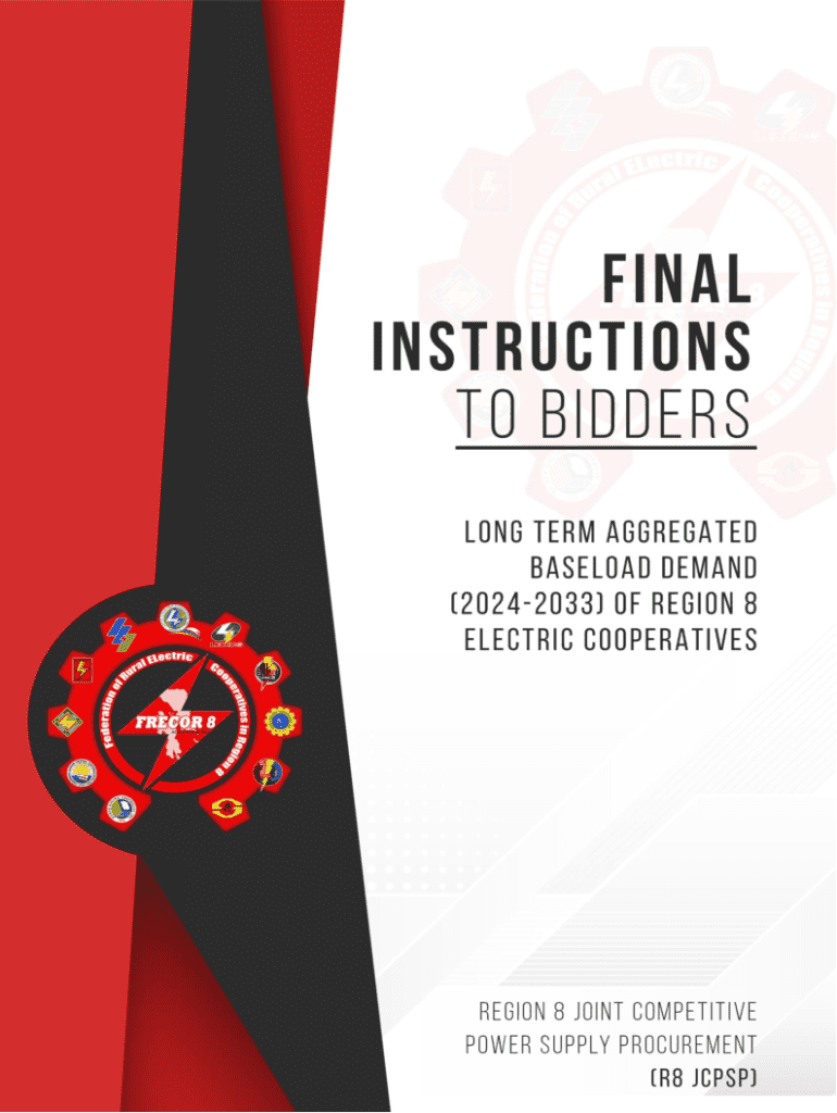 This document contains the guidelines and procedures for the bidding process related to the Region 8 Joint Competitive Power Supply Procurement (JCPSP), focusing on the supply of long-term aggregated baseload power for the electric cooperatives of Region 8. It outlines eligibility requirements for bidders, instructions to bidders, evaluation criteria, and specifics on bid submission and security requirements.