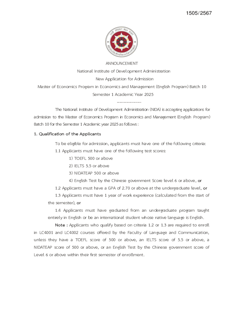 The National Institute of Development Administration (NIDA) is accepting applications for the Master of Economics Program in Economics and Management (English Program) Batch 10 for the Semester 1
