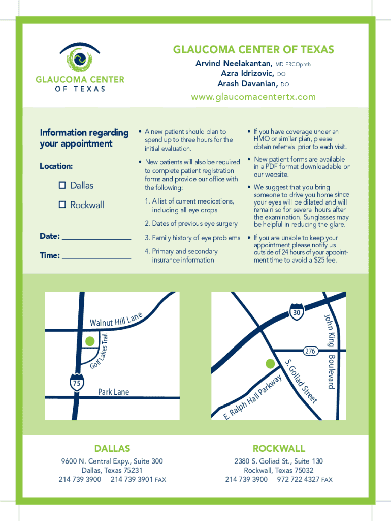 GLAUCOMA CENTER OF TEXAS Arvind Neelakantan, MD FRCOphth Azra Idrizovic, DO Arash Davanian, DOwww.glaucomacentertx.com Information regarding your appointment A new patient should plan to spend up to three hours for the initial evaluation. If you have coverage under an HMO or similar plan, please obtain referrals prior to each visit.Location: New patients will also be required to complete patient registration forms and provide our ofce with the following: New patient forms