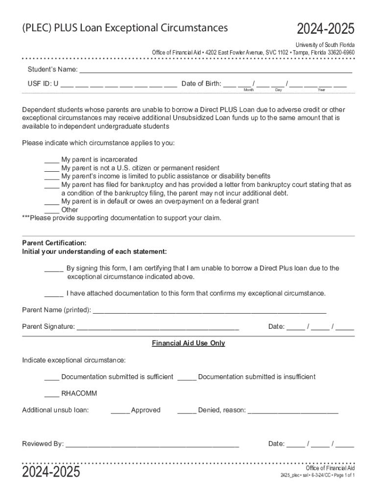 This form allows dependent students at the University of South Florida to apply for additional Unsubsidized Loan funds due to exceptional circumstances that prevent their parents from borrowing a Direct PLUS Loan.
